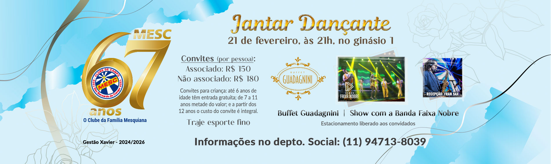 Dia 21 de fevereiro ⏰ a partit das 21h 🎷 Fran Sax – abertura 🎵 Banda Faixa Nobre 🍽️ Buffet Guadagnini No ginásio 1 do Mesc Informações: (11) 94713-8039 ...