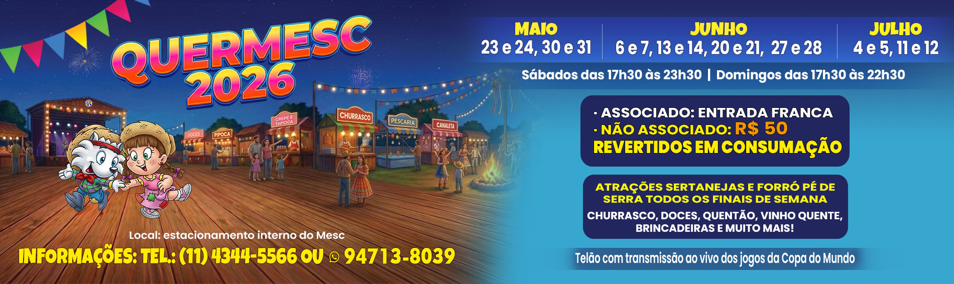 Muito sertanejo e forró pé de serra Comidas típicas de dar água na boca Brincadeiras para toda a família E ainda telão com jogos da Copa ao vivo! De maio a julho Sábados e domingos a partir das 17h30 Associado: entrada gratuita Não associado: R$ 50 (convertidos em consumação) ...